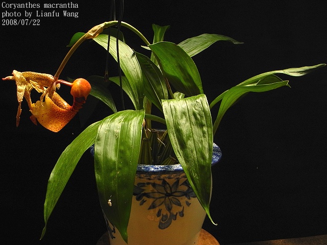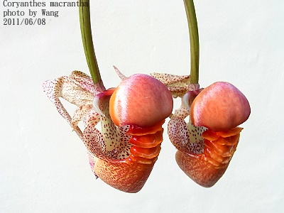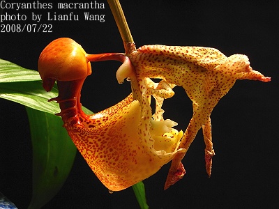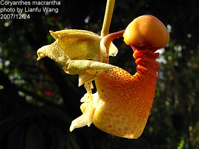 Specific name : Coryanthes macrantha Distribution : Colombia ,Venezuela ,Guyana ,Suriname ,Brazil Plant Size : 25 ~ 40 cm Flower Size : 6 x 11 cm Flowering Season : Summer ~ Winter Longevity of Flowers : 5 ~ 7 days Fragrance : Fragrant Sunlight : Moderate Difficulty of Cultivation : Easy |