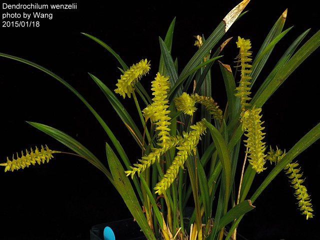 Specific name : Dendrochilum wenzelii Distribution : Philippines Plant Size : 25 ~ 30 cm Flower Size : 0.6 ~ 0.8 cm Flowering Season : Fall ~ Winter Longevity of Flowers : 10 ~ 15 days Fragrance : Faint Sunlight : Moderate Difficulty of Cultivation : Easy |
