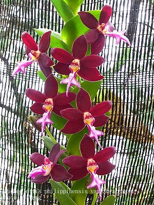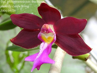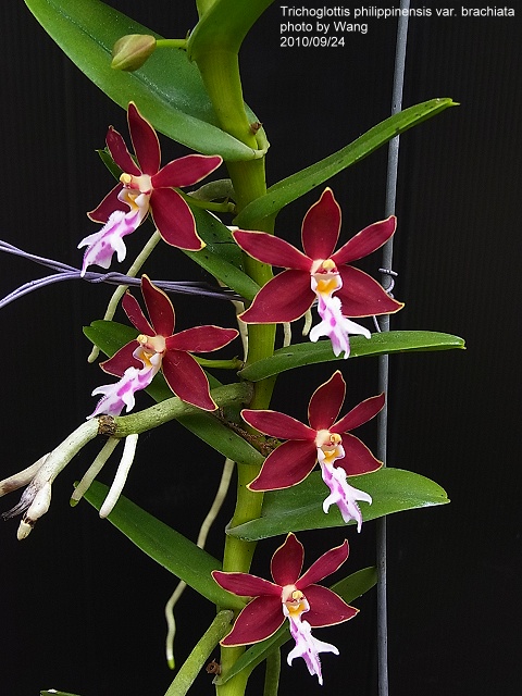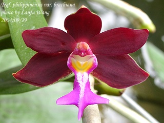 philippinensis var. brachiata ( Trichoglottis atropurpurea ) Distribution : Philippines Plant Size : 20 ~ 100 cm Flower Size : 4.5 cm Flowering Season : Summer ~ Fall Longevity of Flowers : 40 ~ 50 days Fragrance : Fragrant Sunlight : Moderate ~ Strong Difficulty of Cultivation : Easy |